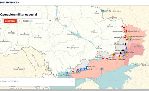 Por ejemplo, en el mapa de hostilidades fechado el 27 de marzo, hay símbolos rojos: la destrucción del equipo de las Fuerzas Armadas de Ucrania, azul: bombardeos realizados por las Fuerzas Armadas de Ucrania y símbolos negros que indican batallas en curso.