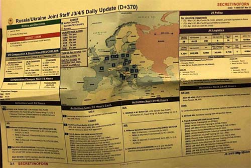 De acuerdo con los datos del medio, en Twitter y otros sitios web aparecieron, según evaluaciones de analistas, más de 100 documentos, uno de los cuales, fechado el 23 de febrero, está marcado como 'Secret/NoForn' ('Secreto/No para extranjeros'), lo que significa que no está destinado a ser compartido con otros países. Posteriormente, en el sitio web 4chan apareció otro: un mapa que supuestamente muestra el estado de las hostilidades que tienen lugar en la estratégica ciudad de Artiómovsk (conocida como Bajmut en Ucrania).