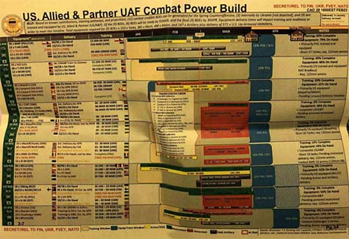 Los documentos también describen las expectativas de las entregas de armas a Ucrania desde los EE. UU. y otros países de la OTAN junto con los programas de entrenamiento para las fuerzas ucranianas a medida que se acerca la contraofensiva de primavera. La línea de tiempo se extiende desde enero hasta abril, detallando doce brigadas ucranianas en construcción y las armas que han sido o serán suministradas. Se dice que nueve brigadas están armadas y entrenadas por los aliados de EE. UU. y la OTAN, y se dice que seis estarán listas a fines de marzo, mientras que el resto estará en acción a fines de abril. Se dice que las brigadas requieren 253 tanques, 381 vehículos mecanizados, 480 vehículos motorizados y más.