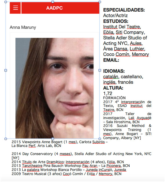 Vamos a adjuntar el CV que Anna ha entregado a la Asociación de Actores y Directores Profesionales de Cataluña, no para intentar buscarle trabajo que sabemos ya no le faltará a estas latitudes, sino para que todo el mundo sepa cómo se monta la independencia en una región donde hasta hace dos días, los independentistas eran el 15%, y esto además de con mucho dinero recogido de tus impuestos y del recorte en hospitales de entre otros servicios, se consigue con figurantes, actores, actrices y directores.