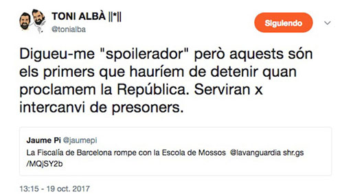 El actor Toni Albà, col·laborabor habitual de TV3, ha propuesto en twitter detener a los miembros de la Fiscalía de Barcelona una vez Catalunya haya declarado la independencia. "Decidme 'spoilerador' pero estos son a los primeros que deberíamos detener cuando proclamemos la República. Servirán para intercambio de prisioneros ", ha escrito en la red.