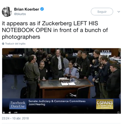 Otro detalle de lo más alarmante fue que Zuckerberg se fue dejándose en la mesa la libreta abierta. Los fotógrafos se tiraron encima de ella para fotografiar su contenido, algo alarmante teniendo en cuenta que en sus manos están los datos personales de miles de personas.
