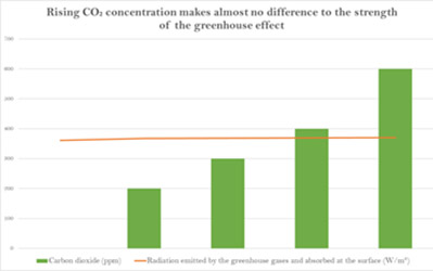 IMAGEN: A medida que la concentración de CO? aumenta de 0 a 600 partes por millón (barras verdes), la fuerza total del efecto invernadero, medida como la energía que los gases de efecto invernadero irradian a la superficie de la Tierra, apenas cambia (línea naranja). Fuente: Kininmonth 2022