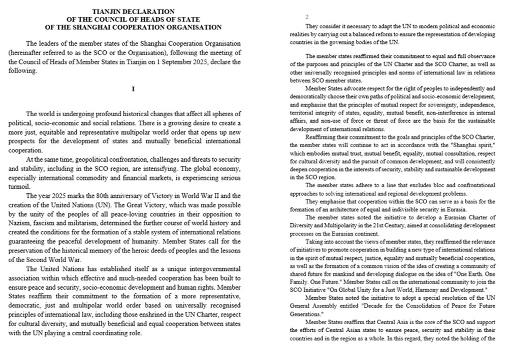 La Organización de Cooperación de Shanghái (OCS) cerró su cumbre en la ciudad china de Tianjin con la aprobación de la Declaración de Tianjin, un documento extenso que traza la línea política y económica del bloque. En la centralidad de esta declaración se rechazó la unipolaridad de Washington y sus socios europeos.