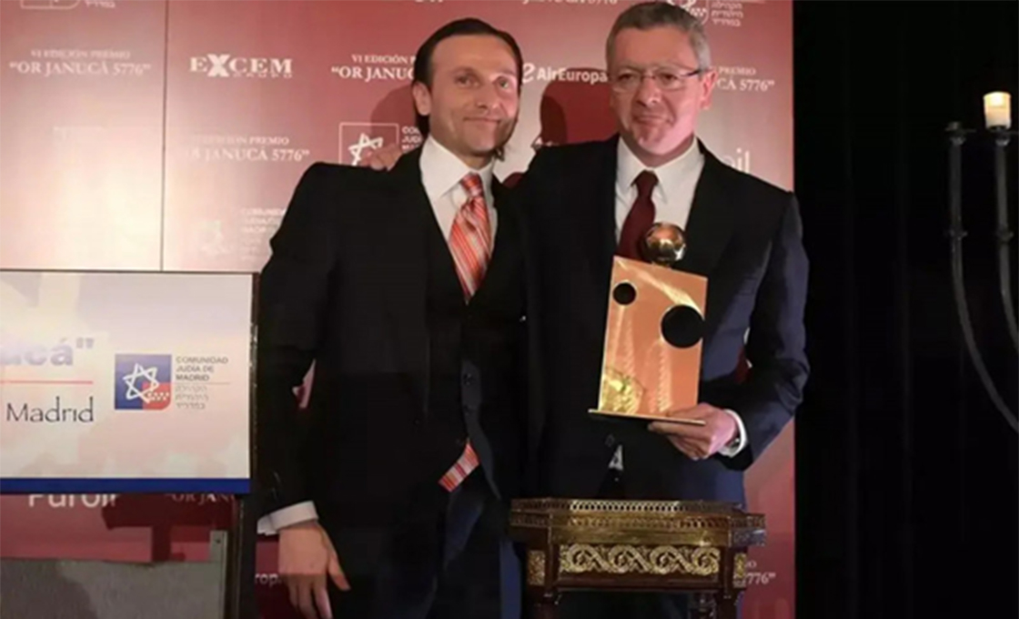 Alberto Ruiz-Gallardón recibe el premio Or Janucá de manos de David Hatchwell, líder del lobby sionista en España. 2015. / Comunidad Judía de Madrid