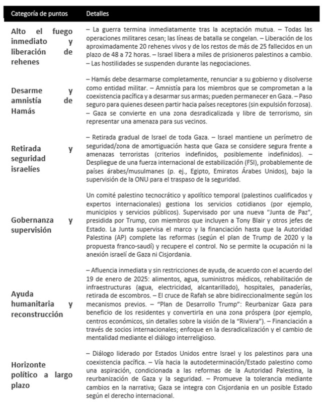 El presidente Trump, durante una conferencia de prensa en la Casa Blanca con Benjamin Netanyahu, reveló una propuesta detallada para poner fin a la guerra entre Israel y Hamás en Gaza, que se ha prolongado desde octubre de 2023 y ha causado más de 66.000 muertes palestinas y una destrucción generalizada. El plan, oficialmente titulado Plan Integral del Presidente Donald J. Trump para Poner Fin al Conflicto de Gaza , está estructurado como un marco de 20 puntos (aunque algunos informes se refieren a él como de 21 puntos, posiblemente incluyendo un preámbulo introductorio). Hace hincapié en un alto el fuego inmediato, la liberación de rehenes, el desarme y la exclusión de Hamás del gobierno, la supervisión internacional, una reconstrucción masiva y una vía vaga hacia la autodeterminación palestina. Netanyahu respaldó el plan, afirmando que logra los objetivos bélicos de Israel, mientras que Trump advirtió que Hamás debe aceptarlo o enfrentar la destrucción con el pleno respaldo estadounidense a Israel. Hamás declaró que no había recibido la propuesta por escrito, pero que la estudiaría de buena fe .