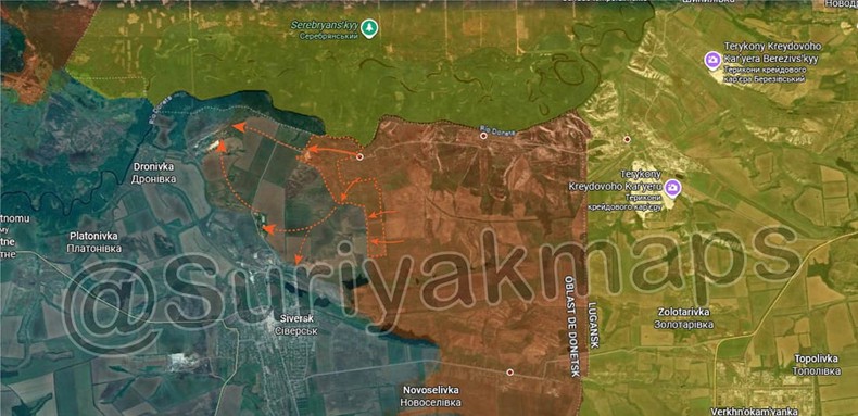 Como se puede ver al norte, la zona forestal de Serebriansky ha colapsado para las Fuerzas Armadas de Ucrania (FAU), mientras los rusos avanzan aún más a través de Yampil. En Suriyak, toda la zona al norte de Seversk también está bajo control ruso parcial, de ahí la designación en colores claros:
