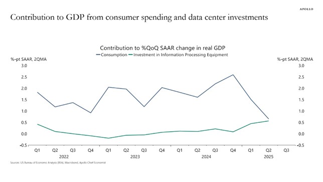 Torsten Sløk, economista jefe de Apollo Global Management, la contribución de las inversiones en centros de datos al (lento) crecimiento del PIB real estadounidense ha sido igual al gasto de los consumidores durante el primer semestre de 2025 (