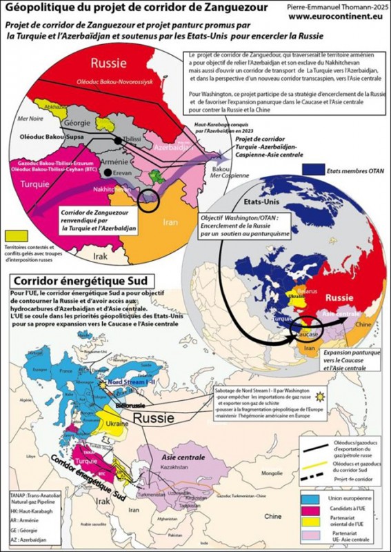 Para Washington, este proyecto forma parte de su estrategia de cercar a Rusia promoviendo la expansión panturca en el Cáucaso y Asia Central para contrarrestar y repeler la influencia rusa y china en estas zonas estratégicas [4] . El papel de Turquía como guardián del estrecho turco y contrapeso geopolítico a Rusia en el Cáucaso, el mar Negro, el Mediterráneo, Asia Central y Oriente Medio es, por lo tanto, una prioridad para Estados Unidos. Es un elemento esencial de su postura geopolítica. Turquía también es el garante del corredor energético que atraviesa el sur del Cáucaso en el eje Azerbaiyán-Georgia-Turquía [5] , con el apoyo de Estados Unidos, pero también de la OTAN y la UE para eludir a Rusia.