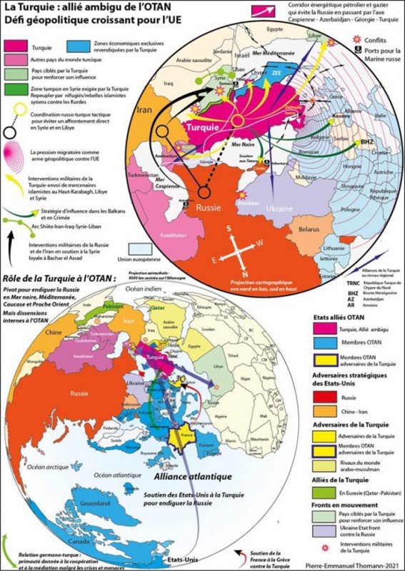 Según la estrategia geopolítica estadounidense, Turquía es un Estado pivote del Rimland desde el cual Washington puede llevar a cabo una política ofensiva contra Rusia por delegación [6] , apoyando el panturquismo, el neootomanismo y el islamismo en el Cáucaso, Asia Central, Oriente Medio, Libia, los Balcanes, pero también en territorio ruso con población tártara musulmana, empezando por Crimea [7] . Esta estrategia también puede extenderse al interior de Rusia [8] . (Véase el Mapa 2: Turquía: Aliado ambiguo de la OTAN - Desafío geopolítico creciente para la UE)