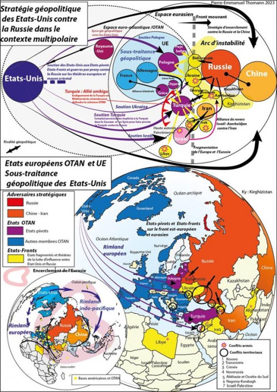 Desde la perspectiva de Washington, Turquía, pero también Ucrania, son estados clave para controlar el Rimland con el fin de fracturar Eurasia y torpedear cualquier acuerdo continental euroasiático a lo largo del eje París-Berlín-Moscú-Pekín. El "Rimland" es la franja costera que rodea el continente euroasiático. Su control por parte de Estados Unidos permite la creación de una zona de amortiguación alrededor del "Heartland", el corazón del espacio euroasiático. Esta doctrina geopolítica hereda la visión del geopolítico estadounidense Nicolas Spykman (1893-1943), quien reformuló la doctrina de Halford John Mackinder (1861-1947). Desde la Guerra Fría, Turquía ha ocupado una posición estratégica especial en este sistema, en el flanco sur de la OTAN para contener a la URSS, pero hoy también como pivote ofensivo contra Rusia hacia el Cáucaso, Asia Central, Oriente Medio y el Mediterráneo.