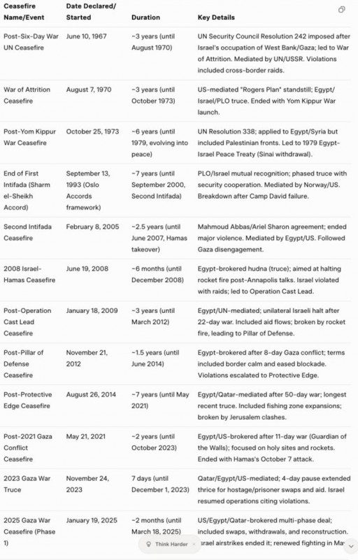 A juzgar por la historia, no hay ninguna posibilidad de que este acuerdo produzca la paz que Donald Trump imagina. Desde la Guerra de los Seis Días de 1967, el conflicto israelí-palestino ha presenciado numerosos ceses del fuego (también llamados treguas, hudnas o armisticios), principalmente entre Israel y grupos palestinos como la OLP, Fatah, Hamás y la Yihad Islámica Palestina (YIP). Estos suelen contar con la mediación de la ONU, Egipto, Catar o Estados Unidos y suelen producirse tras escaladas como guerras, intifadas u operaciones en Gaza. El término «declaración» suele referirse a acuerdos formales entre las partes, aunque algunos son unilaterales o impuestos por la ONU.