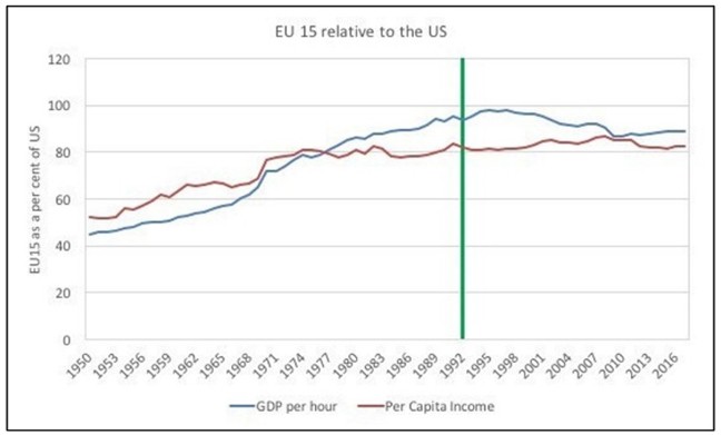 Por el contrario, la integración europea —a lo largo de sus sucesivas fases, incluyendo el Mercado Único, la Unión Europea post-Maastricht y la introducción de la moneda única— ha fracasado en gran medida en mejorar el desempeño económico de los Estados miembros en la mayoría de los indicadores, tanto colectivamente como, para muchos países, individualmente, en relación con sus tendencias previas a la integración. Varios países de la eurozona han experimentado resultados económicos más débiles en comparación con los Estados miembros de la UE que optaron por permanecer fuera de la unión monetaria, mientras que la UE en su conjunto ha tenido un desempeño consistentemente inferior al de Estados Unidos, una entidad económica comparable.