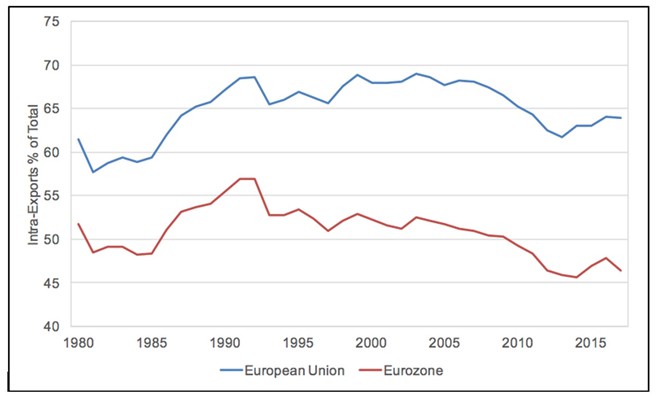 Según la narrativa integracionista, las cosas deberían haber mejorado significativamente después del lanzamiento del euro en 2000. En cambio, a pesar de las predicciones de que una moneda común impulsaría sustancialmente el comercio entre los estados miembros, al eliminar la incertidumbre del tipo de cambio y reducir los costos de las transacciones transfronterizas, el comercio dentro de la zona del euro, como porcentaje del comercio total, en realidad ha estado disminuyendo constantemente desde entonces.