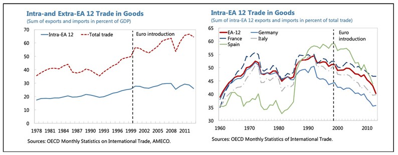 Este declive se aceleró tras la crisis financiera mundial de 2008, lo que sugiere que el marco institucional de la UE es particularmente inadecuado para afrontar grandes crisis económicas. Como señaló un estudio del Fondo Monetario Internacional (FMI) : «Contrariamente a lo esperado, hay poca evidencia de que [el euro] haya estimulado el comercio. […] Como porcentaje del comercio total, el comercio intrazona aumentó de alrededor del 40 % en 1960 a alrededor del 55 % en el momento del Tratado de Maastricht en 1992, pero retrocedió al 40 % en 2013».