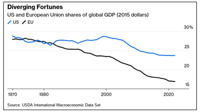 Las implicaciones de esta divergencia van más allá del desempeño económico relativo. La participación de la UE en el PIB mundial se ha contraído del 27 % al 16 % en los últimos treinta años, mientras que la de EE. UU. se ha mantenido estable en torno al 25 %, lo que refleja no solo un desempeño inferior al de EE. UU., sino también una pérdida más amplia de influencia económica en la economía mundial. Como señaló el columnista de Bloomberg Adrian Wooldridge : «La participación de Estados Unidos en la producción mundial aún se sitúa cerca de la de 1980. Europa, y no EE. UU., está pagando el auge de Asia en términos de una participación decreciente en el PIB mundial».