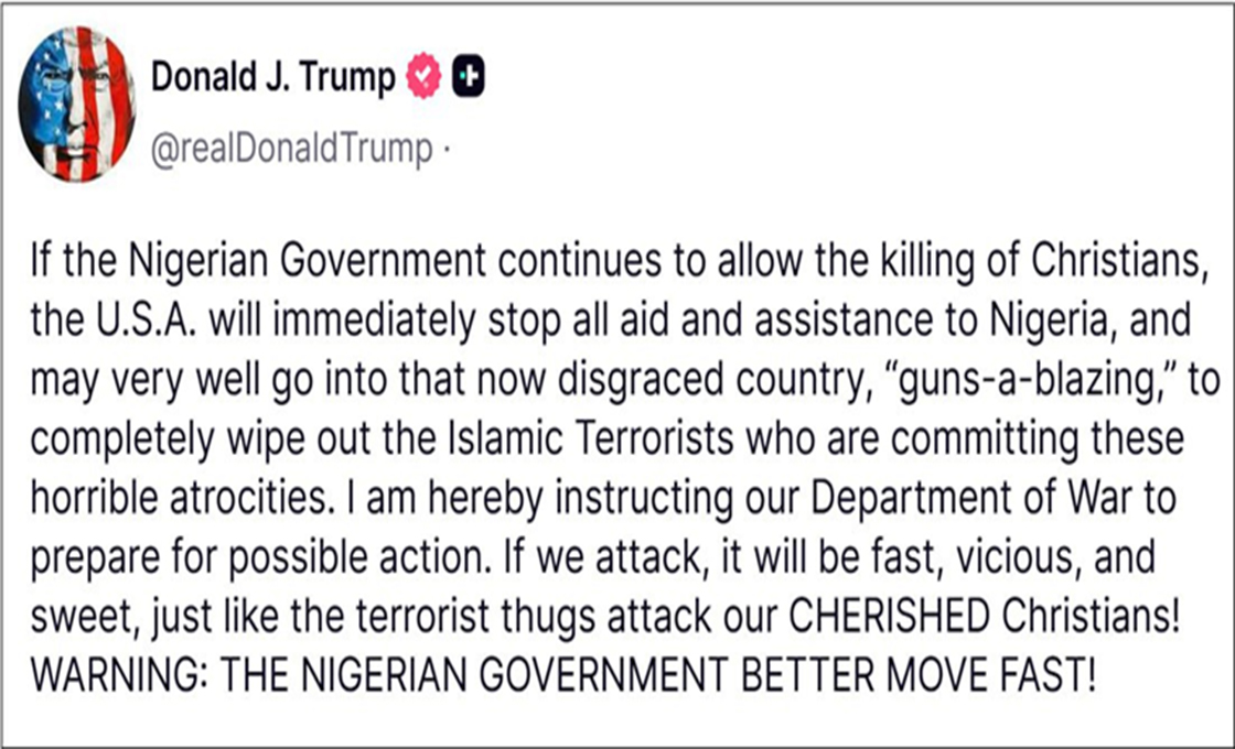 realizó un sonoro saludo político: anunció que está listo para usar la fuerza en Nigeria si no «protege a los cristianos». La declaración sonó como un golpe en la mesa, con una promesa de actuar «rápida y duramente».