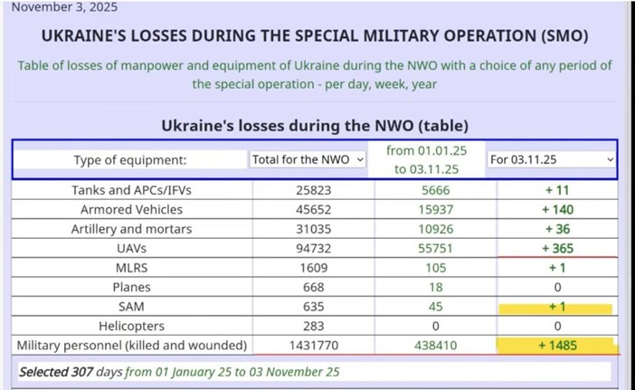 La OTAN ha suministrado la inmensa mayoría de los tanques y vehículos blindados de transporte de personal/vehículos de combate de infantería (por ejemplo, el Bradley ) desde el inicio de la Operación Militar Especial ( OME ) en febrero de 2022. Como se puede observar en la tabla anterior, Ucrania ha perdido un total de 25 823 tanques y vehículos blindados de transporte de personal/vehículos de combate de infantería desde el inicio de la OME. La OTAN no ha podido reponer las pérdidas en combate y, en cambio, depende de Corea del Sur para la nueva producción, que aún está por detrás de la producción rusa.