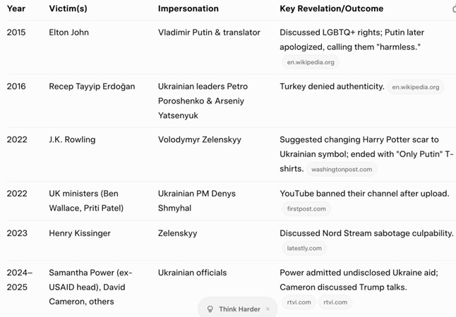 Dejando atrás Pokrovsk y retomando mis entrevistas en Moscú, comparto mis conversaciones con el dúo de bromistas Vovan y Lexus y con Mikhail Shvydhoy. Vovan y Lexus ( en ruso: Вован и Лексус ) son los seudónimos de los bromistas rusos Vladimir Aleksandrovich Kuznetsov, también conocido como Vladimir Krasnov o Vovan, y Aleksei Vladimirovich Stolyarov, alias Lexus, quienes se especializan en elaboradas bromas telefónicas y de vídeo dirigidas a celebridades, políticos y figuras públicas. Comenzaron a colaborar en 2014, combinando comedia con periodismo satírico ; es decir, suplantando la identidad de personalidades para obtener declaraciones sinceras o comprometedoras, a menudo sobre temas geopolíticos como Ucrania, las relaciones entre Rusia y Occidente y las sanciones. Su trabajo me resulta sumamente entretenido.