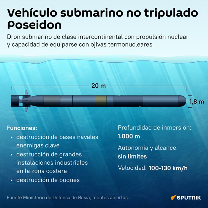 1. Poseidón: El Verdugo Abisal. Este dron submarino nuclear redefine la guerra naval. Operando a profundidades de hasta 1.000 metros y a velocidades que superan "con creces" a todos los buques de superficie, es esencialmente imparable con la tecnología actual. Su propulsión nuclear le otorga una autonomía prácticamente ilimitada, permitiéndole patrullar silenciosamente durante meses antes de desatar una carga nuclear de megatones capaz de aniquilar ciudades costeras o generar tsunamis artificiales para destruir puertos y bases navales. Como señaló Putin, su potencia supera incluso a la del misil balístico intercontinental Sarmat.
