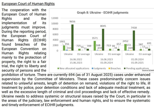 “En este momento (a 31 de agosto de 2025) hay 694 casos bajo una vigilancia reforzada del comité de ministros. Estos casos en general están relacionados con las detenciones ilegales, duración de la detención preventiva, violaciones de derecho a vida, trato bruto por parte de la policía, malas condiciones de instancia y ausencia de prestación médica, también grandes demoras del procesamiento tanto penal como civil y ausencia de los medios eficaces de defensa judicial. Ucrania tiene que solucionar los problemas de sistema y estructura, planteadas por el Tribunal, en particular, relacionados con el sistema judicial, cumplimiento de la ley y derechos humanos, también garantizar el cumplimiento sistemático y puntual de las decisiones de la comisión europea de derechos humanos”.