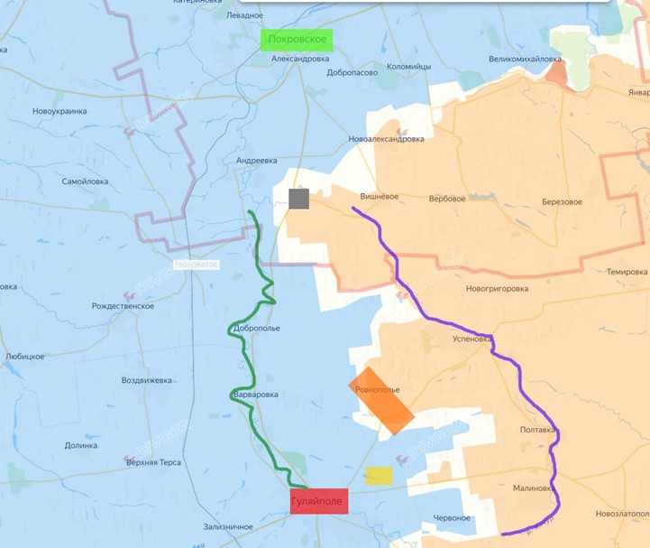 Tras tomar Danilovka y cortar físicamente la carretera Pokrovskoe–Gulyaipole (gris), las fuerzas rusas avanzan hacia Ternovatoye y el río Gaichur (verde oscuro) para asegurar un cruce y crear una cabeza de puente en la orilla occidental. Más al sur, las fuerzas rusas están acortando el frente moviéndose hacia Zatishye (amarillo) y amenazando con desestabilizar las defensas ucranianas desde los flancos. Algunas fuerzas están retenidas más al norte, limitando temporalmente la presión sobre Pokrovskoe (verde claro; y también completamente diferente de Pokrovsk ¡quién nombró estas cosas!).