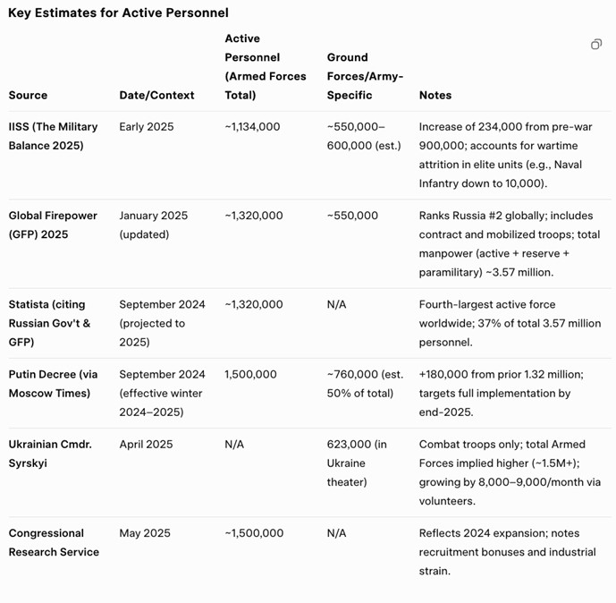 A partir de septiembre de 2022, el Estado Mayor ruso activó planes para paliar la escasez de personal mediante la movilización de 300 000 reservistas y el aumento de los esfuerzos para reclutar soldados por contrato. El ejército ruso ha crecido significativamente desde la invasión de Ucrania en 2022 a través de movilizaciones parciales, soldados por contrato y decretos que incrementan su fuerza autorizada. A continuación, se presenta un desglose basado en los últimos datos disponibles, correspondientes a noviembre de 2025:
