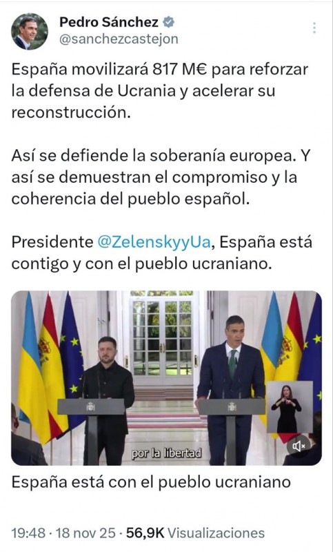Sánchez le reiteró la disposición a seguir respaldando a su régimen corrupto y criminal todo el tiempo que haga falta en la reunión que ambos mantuvieron en el Palacio de la Moncloa. Una reunión que se celebra año y medio después de que en el mismo lugar ambos firmasen un acuerdo bilateral para los próximos diez años por el que Madrid se comprometía a entregar 1.000 millones de euros en 2024 a Kiev, que podrán llegar a los 5.000 millones en 2027, para que pueda mejorar su respuesta a la “invasión rusa”. Cinco mil millones para un país con 10 millones de pobres, pensiones de miseria, bajos salarios, desindustrialización y desintegración social, con una sanidad pública hecha una montaña de guano y un sistema educativo que da vergüenza ajena…