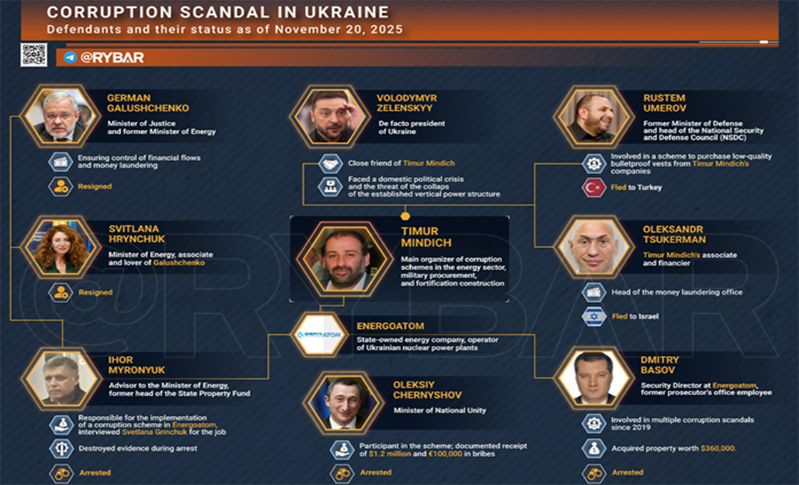 Los medios ucranianos reportan crecientes temores de una crisis más profunda si Zelenski lanza un contraataque contra los organismos anticorrupción NABU y SAP, a quienes pretende acusar de "traición" por supuestamente ayudar campañas de presión extranjera. El esquema comenzó a colapsar tras la repentina renuncia del subdirector de SAP, Sinyuk, quien era central en el plan de Zelenski para purgar el liderazgo anticorrupción.