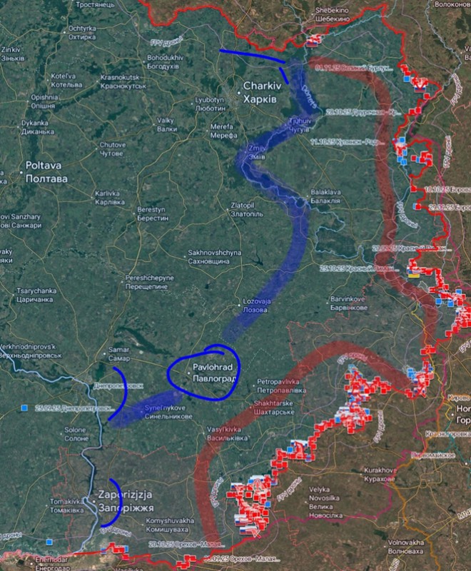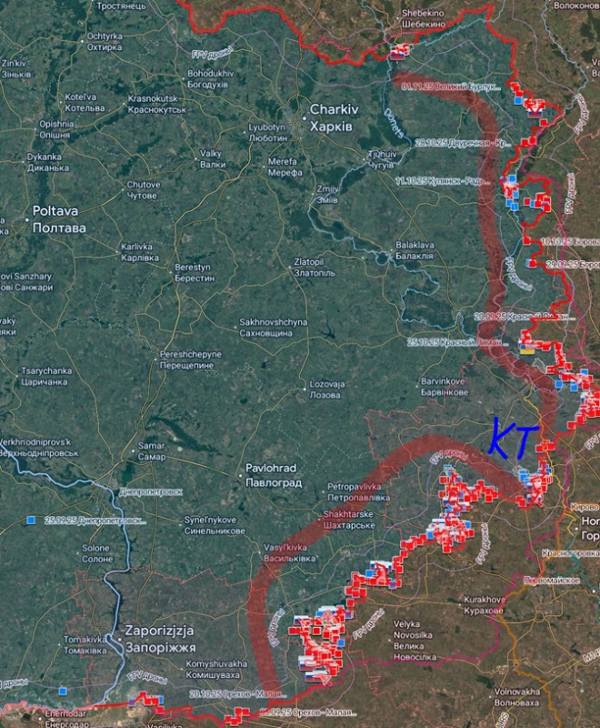 La línea del frente a principios de primavera sería la que muestra la línea sombreada en marrón rojizo. En total, esto podría abarcar unos 7500 km² en 3-4 meses, en comparación con los 6000 km² que se perderían durante todo el año 2025. Aunque ninguna gran ciudad caerá, se observa que la zona de Sloviansk-Kramatorsk-Konstantynivka (KT en azul) quedará semicirculada.