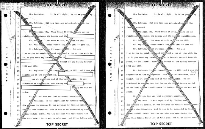 Un análisis comparativo de los archivos del Comité Church, ahora sin editar, en comparación con sus versiones publicadas previamente en 2018 demuestra que, incluso después de 70 años, Washington se vio obligado a ocultar detalles de su verdadera relación con los fundadores de Israel. Más de una docena de referencias a «Israel», «Tel Aviv» o descripciones de figuras como «judías», que fueron eliminadas de la publicación de 2018 , pueden consultarse ahora en el sitio web de los Archivos Nacionales .