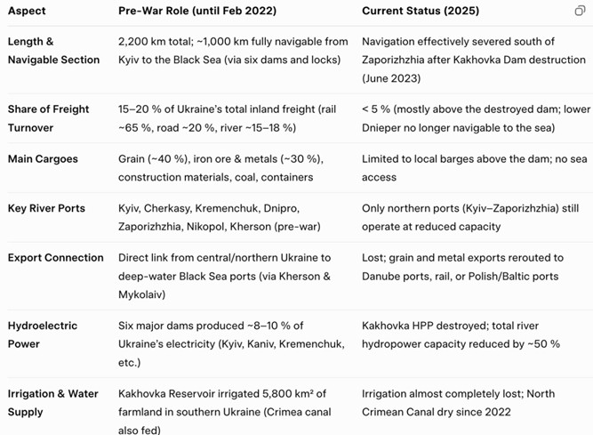 El Dniéper es la principal vía fluvial de Ucrania y, históricamente, una de las arterias económicas más importantes del país. Antes de la invasión rusa a gran escala de 2022, representaba una parte significativa del transporte de mercancías a granel y sustentaba industrias exportadoras clave (grano, mineral de hierro, acero, carbón). La guerra y la destrucción de la presa de Kakhovka en 2023 han reducido drásticamente su contribución a la economía ucraniana. El siguiente gráfico ilustra el daño financiero sufrido por la economía ucraniana como resultado de los combates a lo largo del río Dniéper: