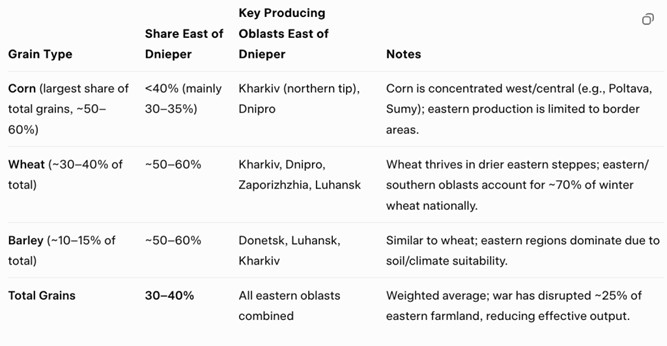 La producción de cereales de Ucrania (principalmente trigo, maíz y cebada) es geográficamente desigual, con el río Dniéper como divisoria: la ribera occidental (que incluye regiones centrales como Poltava y Chernígov) domina la producción de maíz, mientras que la ribera oriental/sur (p. ej., Járkov, Dniéper, Zaporiyia) es más significativa para el trigo y la cebada. Según datos del USDA de antes de la guerra (promedios de la década de 2010 a 2021), aproximadamente entre el 30 % y el 40 % de la producción total de cereales de Ucrania proviene de tierras al este del Dniéper.