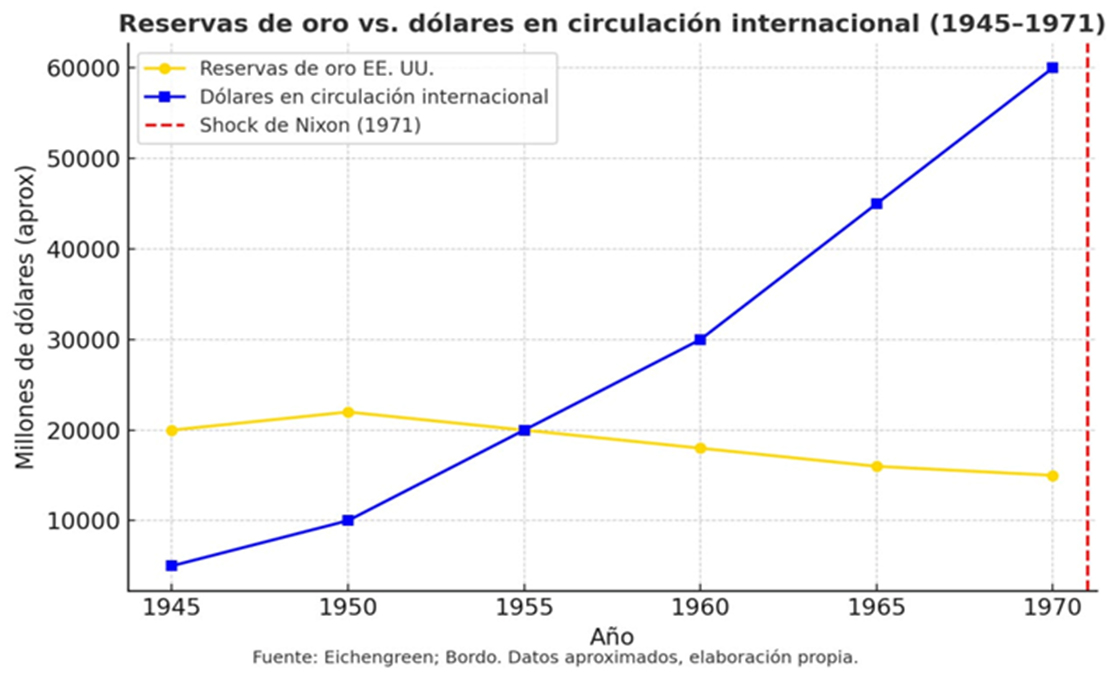 Ese recurso inmediato permitía gastar sin límite interno, pero trasladaba el coste al resto del mundo. Los dólares en circulación crecieron hasta superar con mucho las reservas de oro de Fort Knox que debían respaldarlos al tipo fijo de 35 dólares por onza.