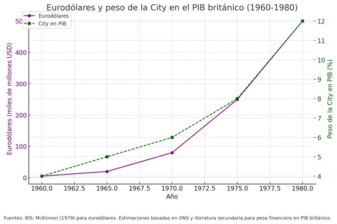 El desequilibrio no se limitaba a la emisión dentro de Estados Unidos, sino que se multiplicaba fuera de sus fronteras a través del mercado de eurodólares, depósitos denominados en dólares pero gestionados por bancos europeos y, por tanto, fuera del control de la Reserva Federal. Su expansión fue consecuencia directa de dos fuerzas que se entrelazaron: por un lado, la propia lógica del sistema de Bretton Woods y del dilema de Triffin, que exigía a Estados Unidos exportar dólares para sostener la liquidez mundial; por otro, el clima de la Guerra Fría, que llevó a países como la Unión Soviética a mantener sus reservas lejos de la jurisdicción estadounidense. El resultado fue una marea de dólares circulando en Londres y otras plazas financieras, generando una liquidez global que escapaba a toda disciplina monetaria.