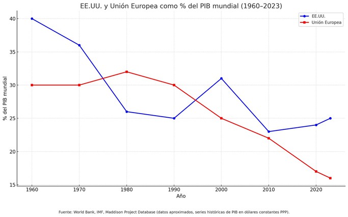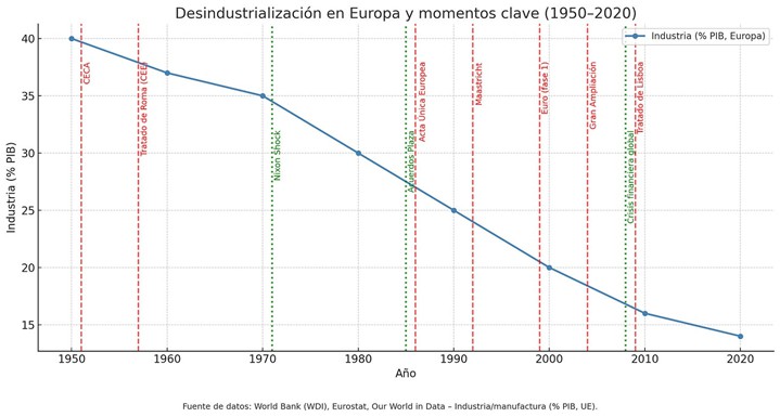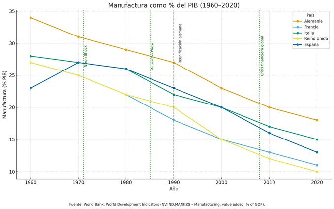 Esa transición —de potencia productiva a potencia financiera— constituye el verdadero punto de partida de lo que denominaremos como el declive relativo de Occidente. Medio siglo después, se hace evidente que esa moneda que sostuvo a Occidente fue también el instrumento que, al desvincular poder financiero de poder industrial, empezó a minar sus fundamentos. El siguiente capítulo de esta historia muestra cómo esa pérdida de músculo productivo no fue solo estadounidense: también Europa entró en el mismo ciclo de desindustrialización, aunque por razones propias.