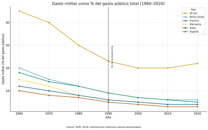 Entre 1960 y 1990, el gasto militar como porcentaje del presupuesto público descendió de manera gradual en las potencias europeas. Pero tras la caída del Muro de Berlín la tendencia se aceleró. Francia pasó de destinar cerca del 18 % de su gasto público a defensa en 1960 a apenas un 5 % en 2020; Alemania, del 15 % a un 4 %; España, del 10 % a un 3 %. El Reino Unido, pese a su vocación global, redujo también su esfuerzo a la mitad. Europa abrazaba el bienestar social como prioridad y relegaba la defensa a un segundo plano, confiando en la OTAN para cubrir su seguridad.