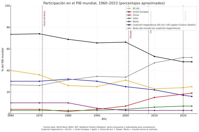 El resultado acumulado de este proceso histórico parece claro: la coalición hegemónica —el Occidente colectivo entendido como Estados Unidos, la Unión Europea y sus aliados estratégicos en Asia— ha perdido la posición de predominio absoluto que ejerció durante la segunda mitad del siglo XX. El siguiente gráfico lo muestra sin ambigüedades: si en 1960 concentraba en torno al 70 % del PIB mundial, hoy apenas representa menos de la mitad. Estados Unidos ha logrado mantener estable su cuota en torno al 25 %, pero el desplome europeo ha arrastrado al conjunto. Lo que la coalición cedió, lo ocuparon China, India y el Sur Global, que convirtieron la externalización productiva y la dependencia energética en palancas de ascenso.