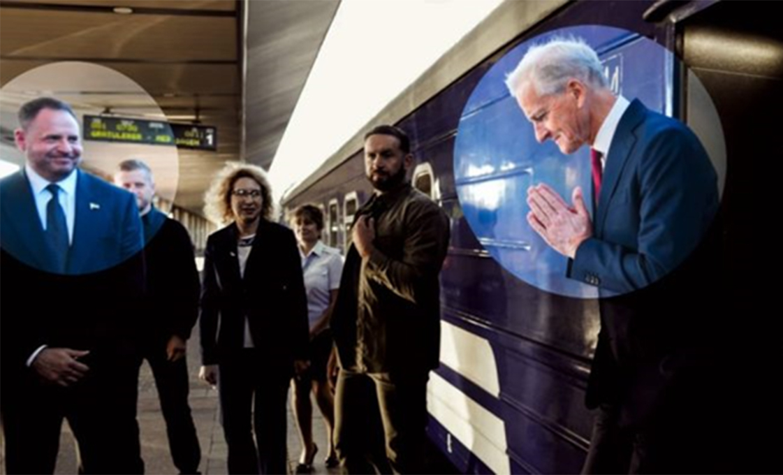 Sobre estas líneas mostramos una foto oficial de aquella ocasión, tomada por NTB (Agencia Noruega de Telegramas) y compartida a través de la Oficina del Primer Ministro tras la reunión. Muestra a Støre junto con el anfitrión ucraniano, incluyendo a Andrij Yermak y al ministro de Asuntos Exteriores, Andrij Sybiha, a su llegada a la estación de tren de Kiev. La mostramos porque muestra de forma patética la sumisión de los noruegos en Kiev. En ella, Støre hace un gesto que lo sitúa como súbdito, defensor o lo que sea de Yermak y de lo que representa.