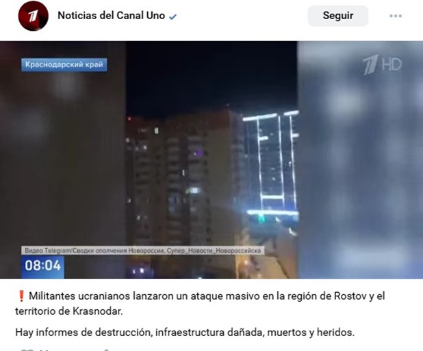 - Los telediarios usando las imágenes del ataque ucraniano a Novorossiysk (Krasnodar) como si fuera ataque ruso a Kiev. Y en reportaje posterior han hecho lo mismo. La traición deontológica y el mercenarismo totalmente naturalizados. No hay ninguna dignidad.