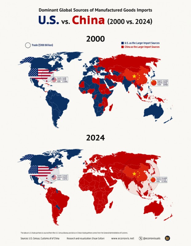 Como muestra claramente el siguiente gráfico, no es solo en Asia donde prácticamente nada funciona económicamente sin China. La supremacía económica de China ha alcanzado proporciones globales y está teniendo un efecto disciplinario.