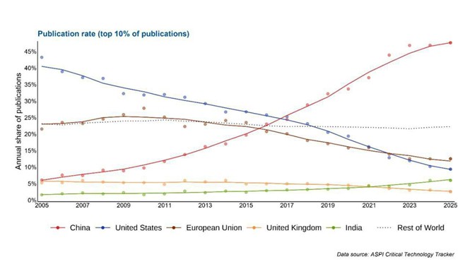 China ocupa la primera posición en 66 de las 74 áreas tecnológicas críticas y emergentes analizadas en 2025, según el índice ASPI Critical Technology Tracker. El liderazgo abarca sectores estratégicos de alto valor.