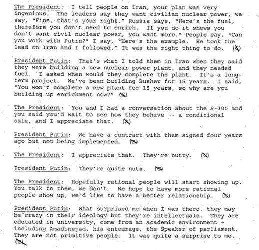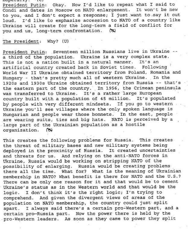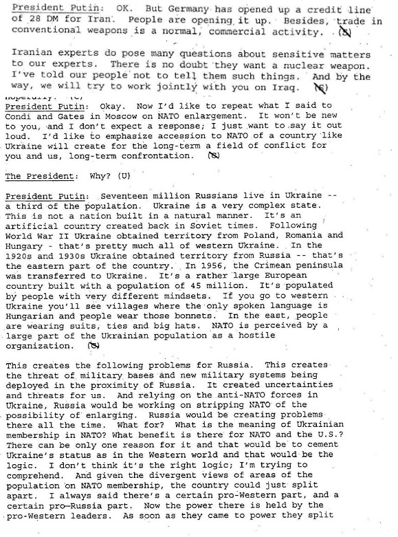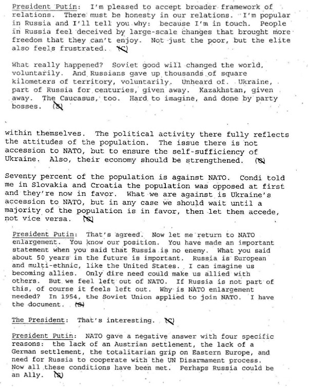 Además, en las transcripciones de 2001 queda registrado que Putin admitía la posibilidad de un acercamiento de Rusia a la OTAN. Afirmaba que la RF "se siente excluida" debido a la expansión de la Alianza, recordaba la solicitud de ingreso de la URSS en la OTAN en 1954 y sostenía que los motivos del rechazo de aquella época ya no eran relevantes.