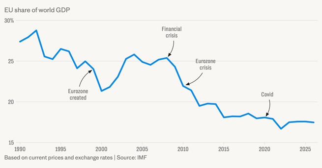 salida al estancamiento económico. La participación de la economía de la Unión Europea en el PIB mundial ha caído del 27% al 17% desde 1990. Y en muchos indicadores, el retraso de Europa solo se está intensificando.