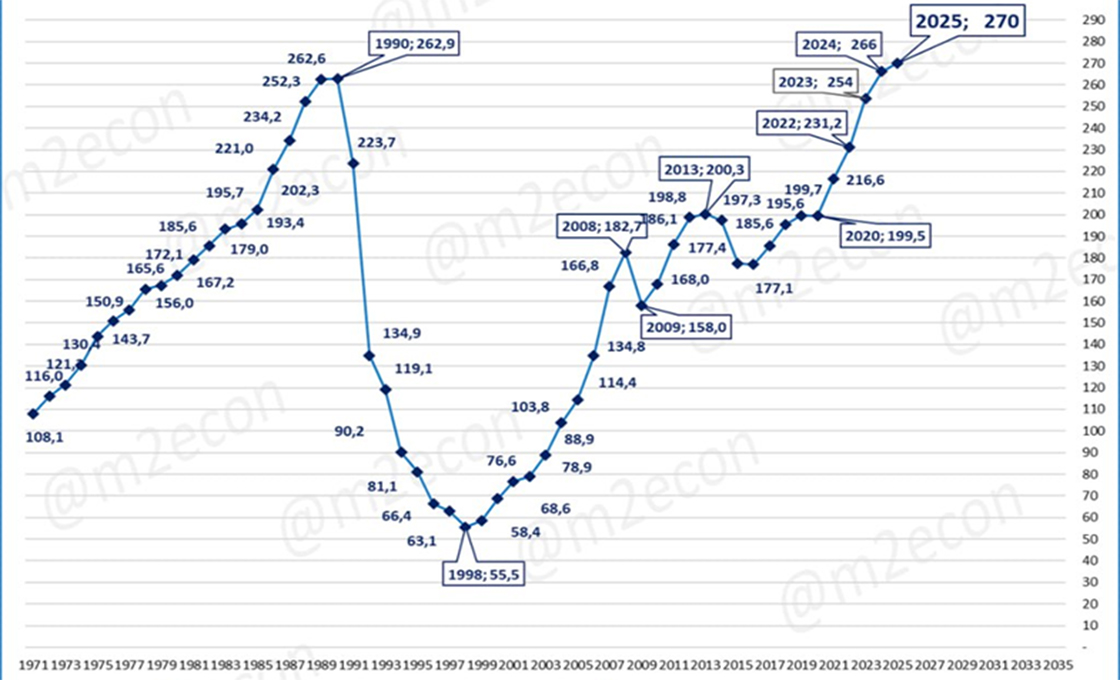 Del reciente monitoreo del economista Sergei Blinov: «Este será solo el segundo año (2025) en el que las inversiones superarán el récord soviético de 1990, que se mantuvo durante 35 años».