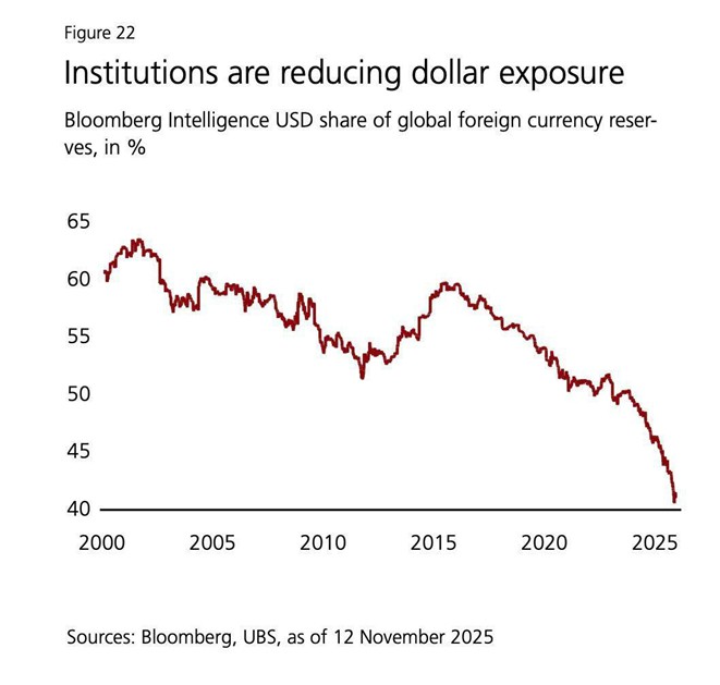 En los últimos 25 años, el uso del dólar estadounidense como reserva monetaria ha disminuido del 61% al 41%. El índice del dólar estadounidense cayó un 9% en 2025, registrando su peor desempeño desde 2017.