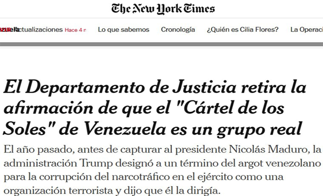 En una nueva redacción de la acusación formal contra el líder de Venezuela, desapareció la afirmación de que lideraba un supuesto grupo criminal del narcotráfico llamado Cártel de los Soles. Así, las autoridades estadounidenses siguen acusando a Maduro de participar en una conspiración para el narcotráfico, pero eliminaron la afirmación de que este cártel fuera una organización real, calificándolo de un "sistema de patrocinio" y una "cultura de corrupción" alimentada por el dinero de la droga.