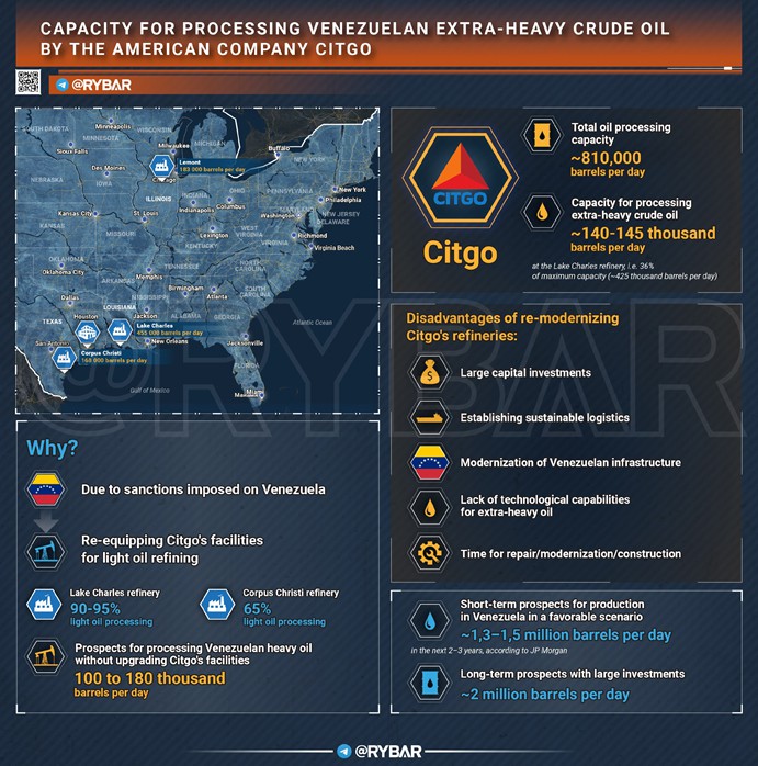 ▪️Tiene tres refinerías de petróleo — dos en la Costa del Golfo Mexicano (Estadounidense) y una en Illinois. Las refinerías en Corpus Christi y Lake Charles estaban específicamente especializadas en procesar petróleo venezolano.
