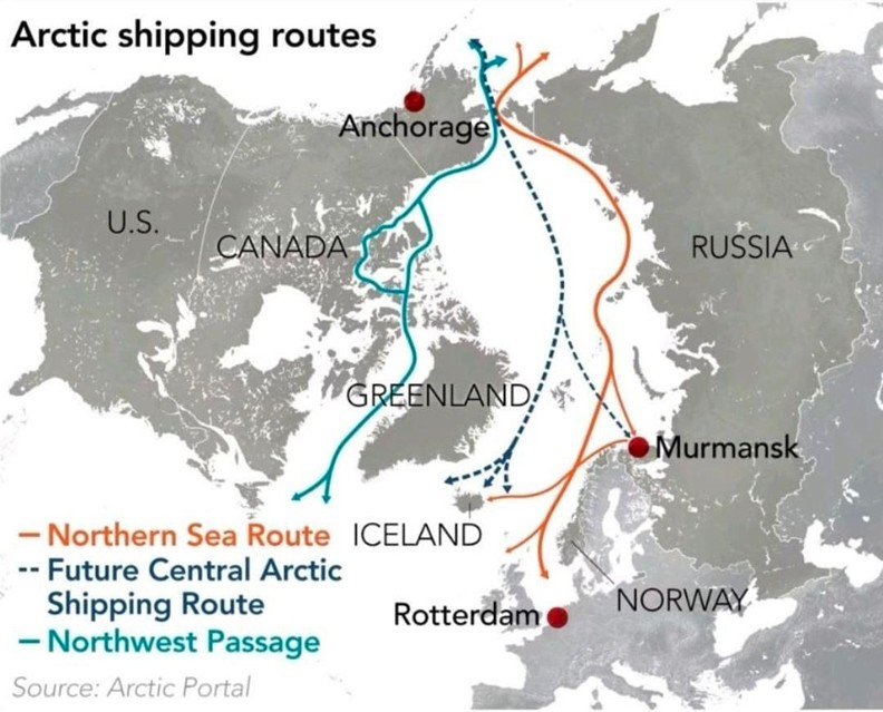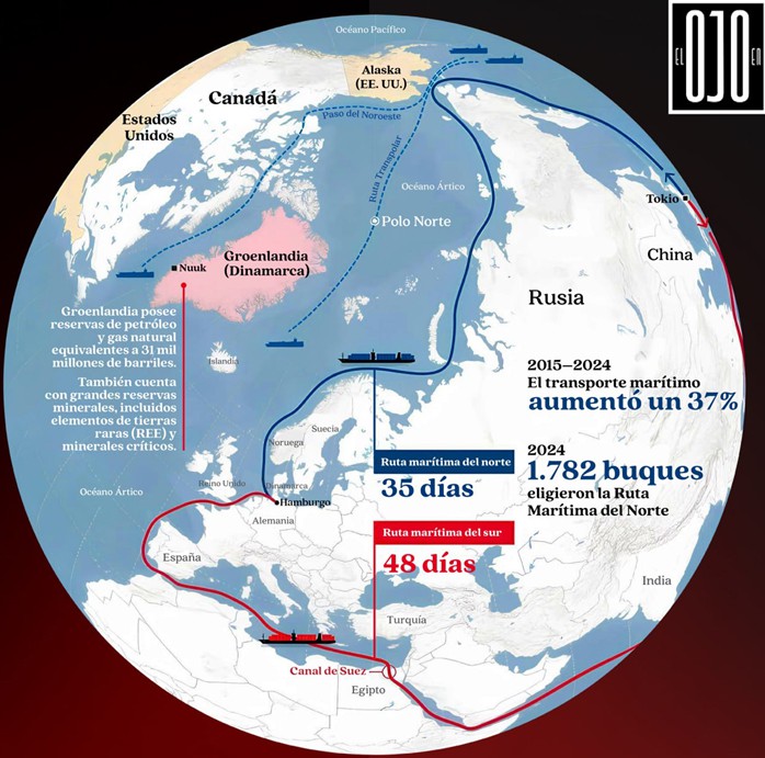 El deshielo acelerado del Ártico está modificando la geografía política de la región. La apertura gradual de rutas marítimas, como la Ruta Marítima del Norte, reduce de manera significativa los tiempos de transporte entre Asia, Europa y América del Norte. Este nuevo corredor marítimo se perfila como un espacio de competencia directa, donde Estados Unidos busca asegurar capacidad de supervisión e influencia antes de que otros actores consoliden posiciones.