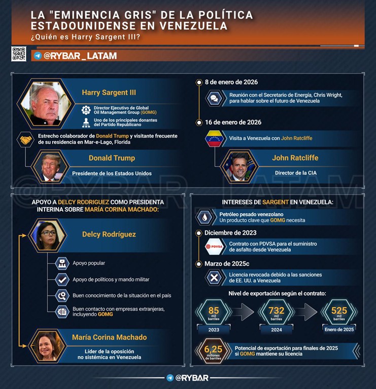 Y ahora Trump ha traído a alguien que conoce bien el mercado venezolano y está familiarizado con funcionarios locales de alto rango – con John Ratcliffe (Director de la CIA), el multimillonario Harry Sargent III también llegó a Caracas el 15 de enero.